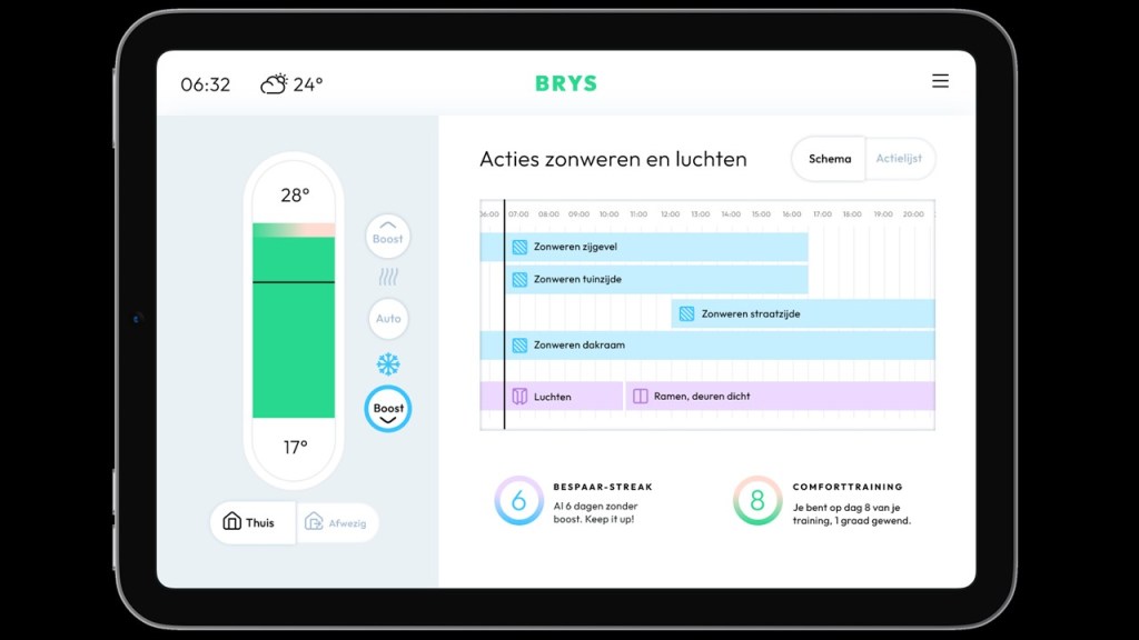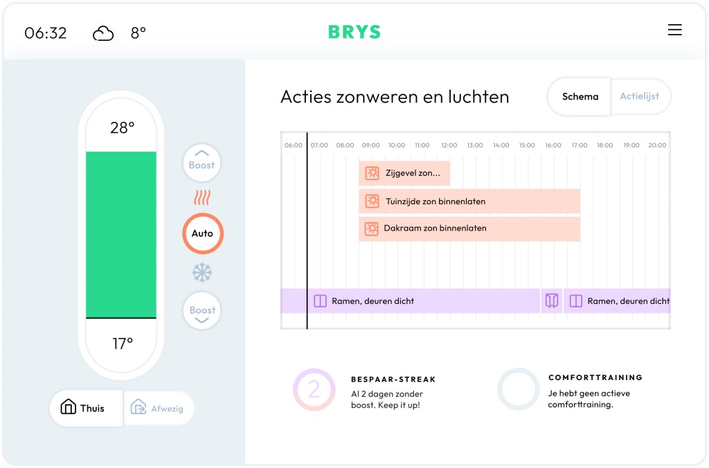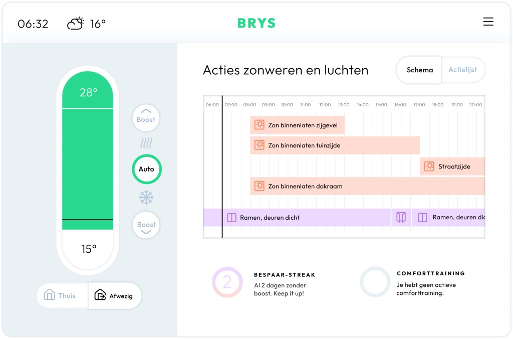 Daarom ondersteunt BRYS huishoudens in het effectief zonweren en luchten van hun woning. BRYS doet dit door middel van een duidelijk schema en een actielijst. Het schema toont wanneer zonwering en ramen geopend en gesloten kunnen worden voor het optimaal gebruik maken van de zon en buitenlucht in het regelen van het binnenklimaat.