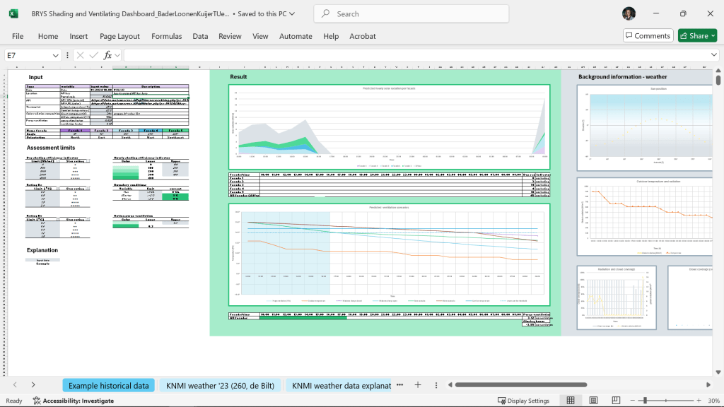 In samenwerking met Vera Bader en Dr. Roel Loonen de afdeling bouwfysica van de TU Eindhoven zijn rekenmodellen ontwikkeld voor het bepalen van de schema’s en effectindicaties voor zonweren en luchten. De Excel file met een model dashboard kan hier worden gevonden. De achtergrond van het model met uitleg over gemaakte keuzes is te vinden in dit bijbehorende rapport.